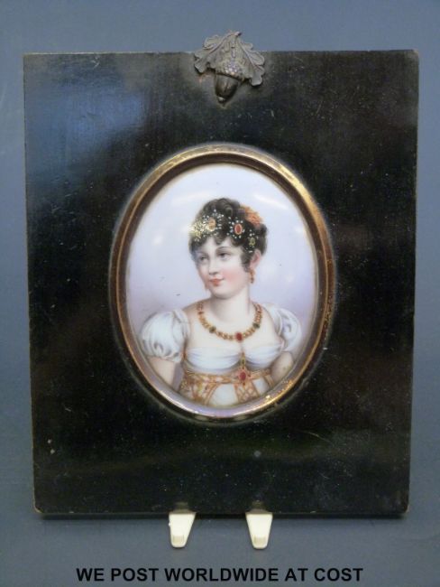 A portrait miniature on porcelain of a bejewelled lady in ebonised frame (overall height 15cm)