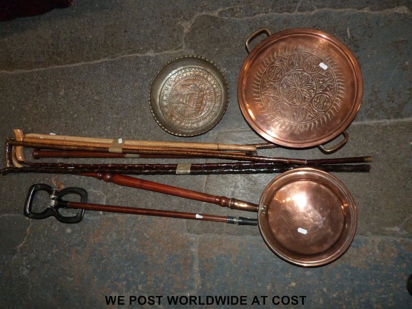 A quantity of copper items including a warming pan, Eastern dish, charger, jam pan and a shooting stick