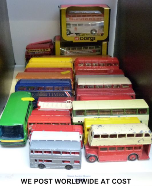 Thirty-one Corgi, Matchbox, Dinky and other diecast model buses and coaches including a Dinky Supertoys School Bus, some in original boxes