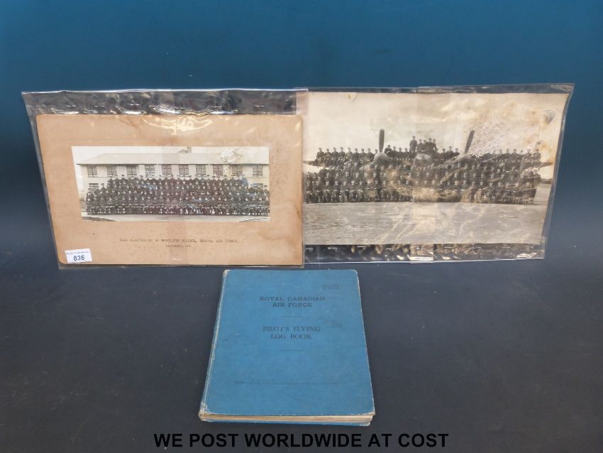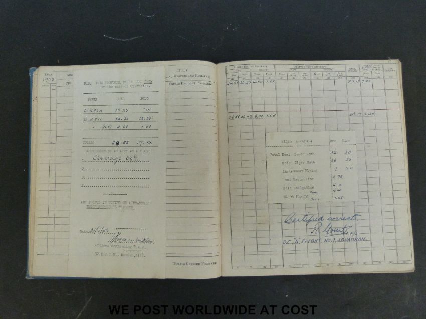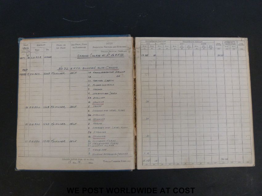 The logbook of Squadron Leader F.E Gee (Royal Canadian Air Force) Commissioned Cranwell 1936 (Pilot Officer Accountant) with the expeditionary force to France 1939/40; evacuated. Squadron Leader (15.6.1940); remustered as Pilot (18.9.1943) and served remainder of the war as a flying instructor. Served in Germany after the war, his last flight was with Air Vice Marshall Pankhurst on his tour of the Middle and Far East in 1955. Discharged with the rank of Squadron Leader. Logbook covers training flights for various students to include D.H. 82C, Harvard, Oxford and Anson, the rear pages also cover link trainer time. With two group photographs (The Electrical & Wireless School in Cranwell 1929 and another undated photograph)