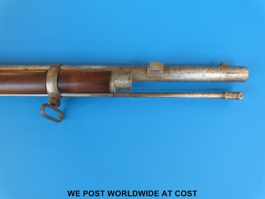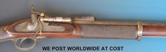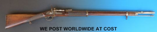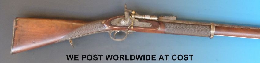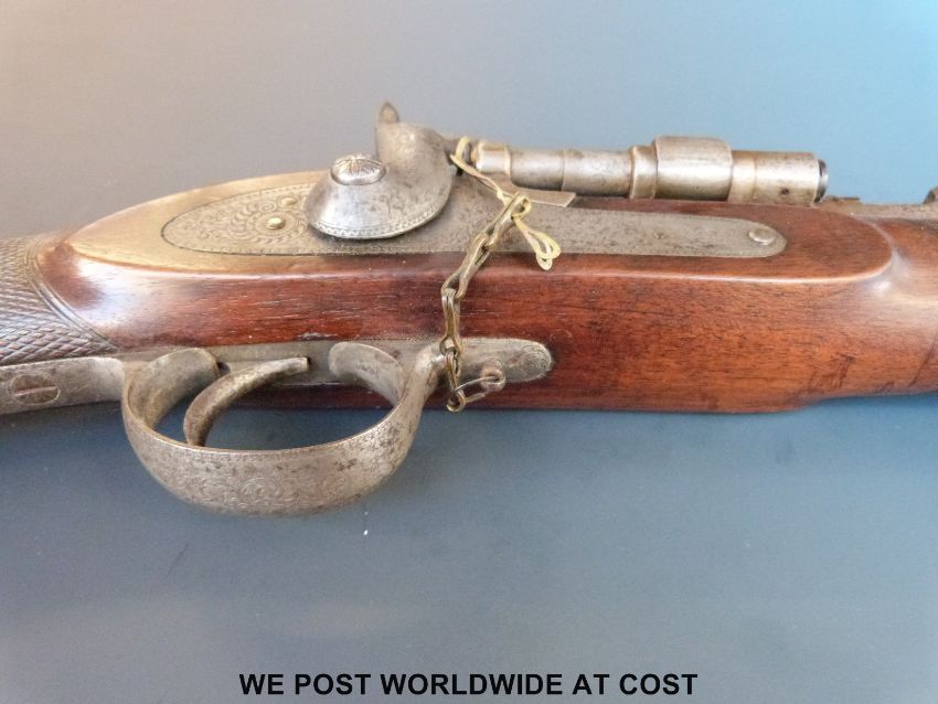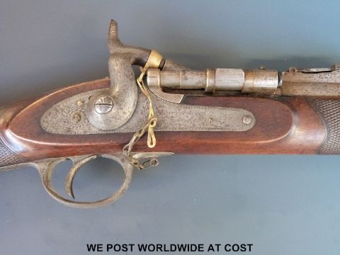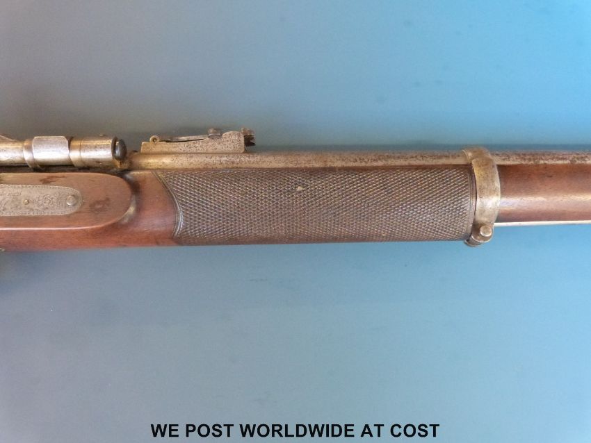 Snider Enfield 2 band percussion hammer action rifle with lock named R Whitehead 1867 and ornately engraved, chequered grip and 33inch barrel, overall length 123cm