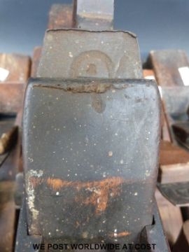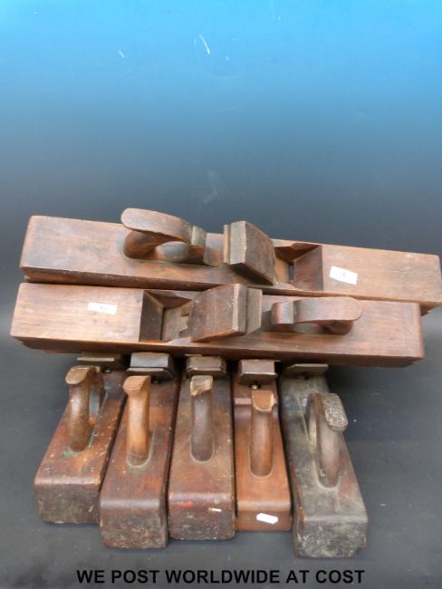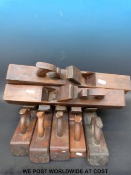 Nine jointing or fore woodworking planes, one initialed RR, another named H. Summer, longest 60cm, shortest 36cm