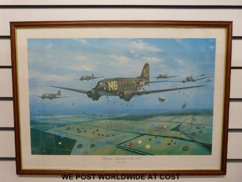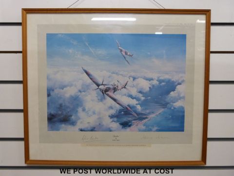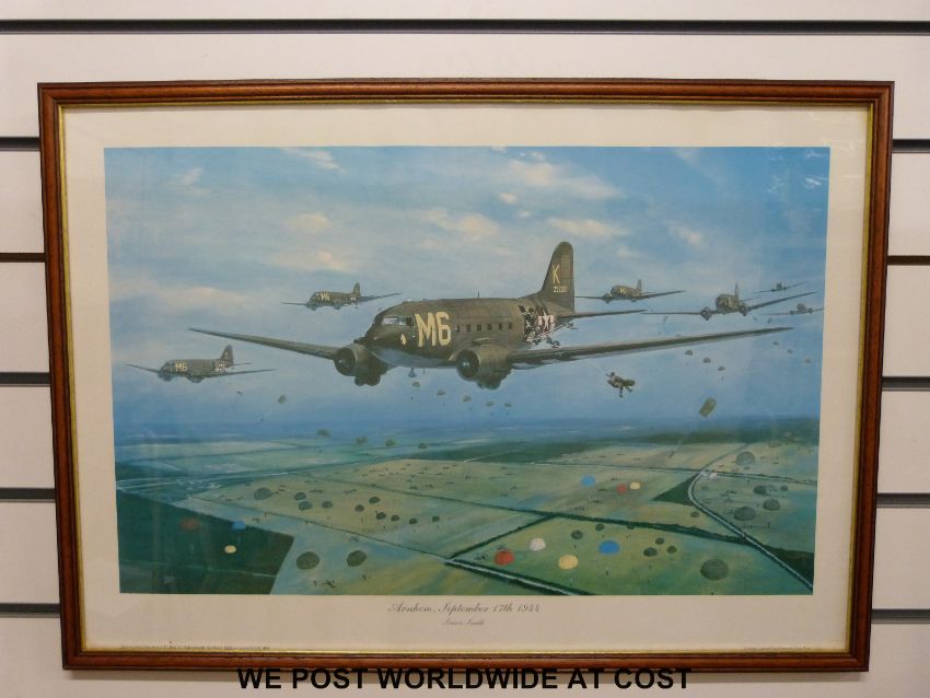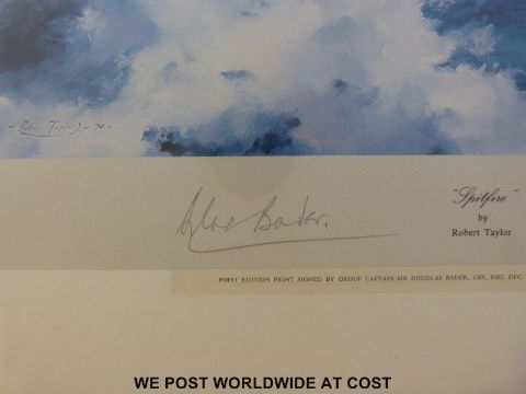 Robert Taylor print 'Spitfire' signed by both Douglas Bader and Johnie Johnson together with a Simon Smith print 'Arnhem', two further aircraft prints, a John King print of Gloucestershire Hussars interest and two prints of Stroud