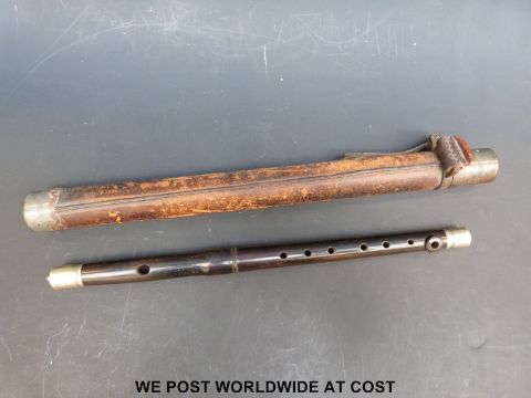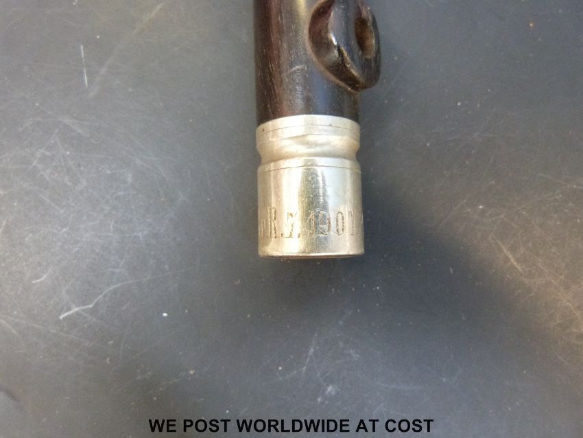A military rosewood fife with white metal mounts in leather bound case. The mount engraved with GrR.7.1907 1B.4.k.111