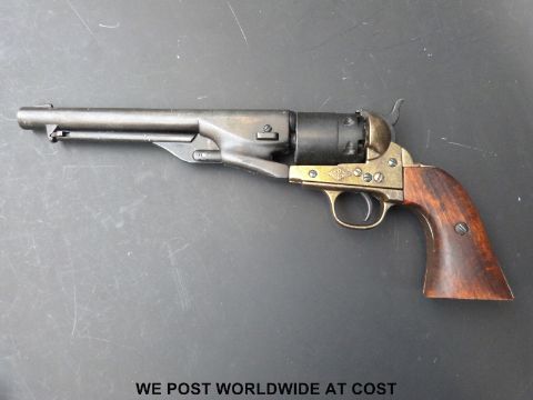 A replica BKA six-shot revolver with brass shaped wooden grips and 20cm barrel, overall length 37cm