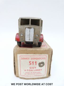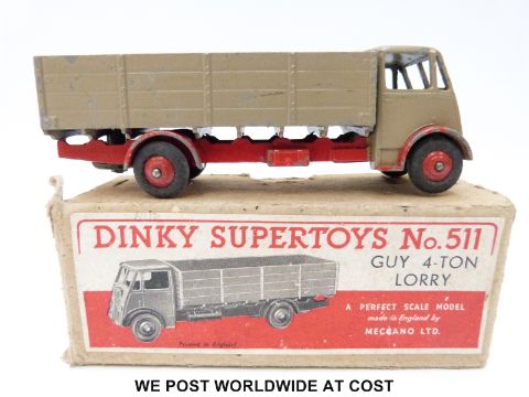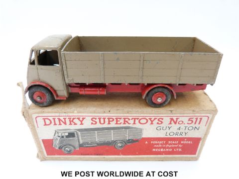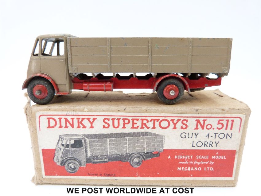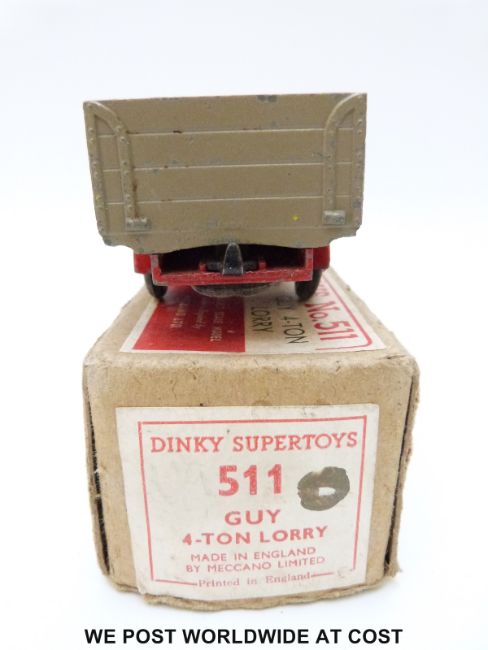 Dinky Supertoys diecast model Guy 4-ton Lorry, 511, with fawn cab and back and red chassis, arches and hubs, in original box