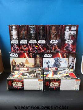 Ten Hasbro Star Wars figures and vehicle sets, Sebulba's Podracer, Anakin Skywalker's Podracer, Poe Dameron and Speeder Bike, Riot Control Stormtrooper Sergent and Assault Walker, Flametrooper, Chewbacca, Kylo Ren, Darth Vader, Finn and First Order Stormtrooper, all in original boxes