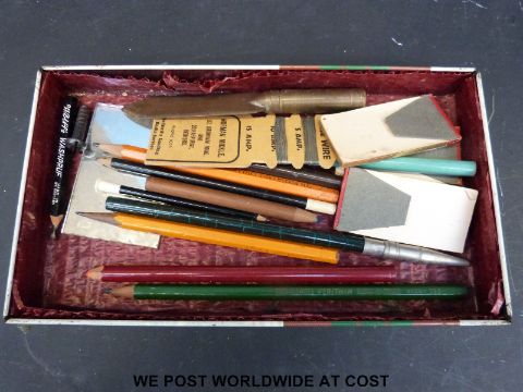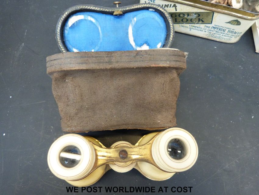 A collection of drawing instruments, stationery items, cased opera glasses, magnifier, 'Siege of Ladysmith' booklet etc