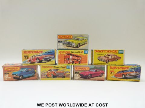 Ten Matchbox Lesney and Superfast 1.75 series diecast model vehicles, 21 25, 29, 41, 51, 67, 70, 74, 74 and 74, eight in original boxes