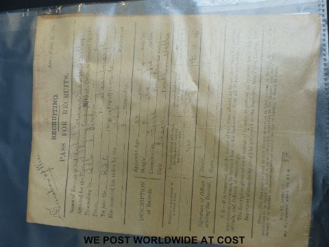 Royal Flying Corps RFC cap badge, two cloth badges including one as a propeller and a recruit's leave of absence pass for Herbert Edward Saville Wortley dated 1916