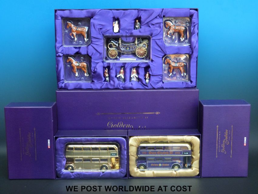 Three Corgi Queen Elizabeth II Golden Jubilee diecast models and model sets comprising State Landau CC09901 and two Routemaster Buses CC25903 and CC25902, all in original boxes