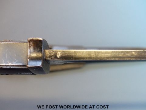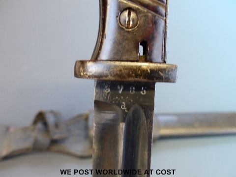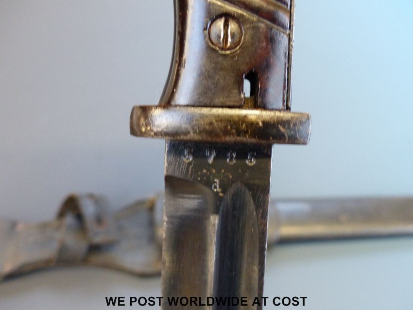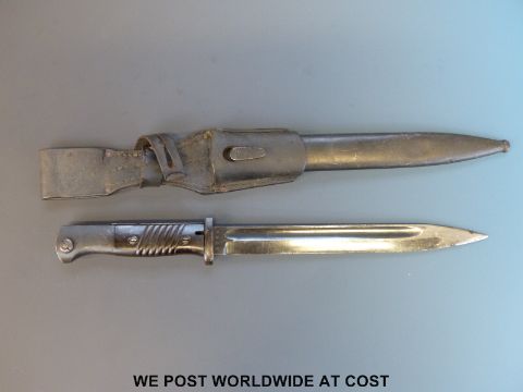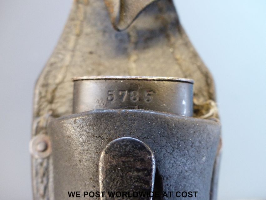 A 1940 Nazi German K98 1884/98 bayonet by Jacobs and Co, the 25cm fullered blade stamped 'J. Sch', matching numbers 5785, black steel scabbard, leather frog and retaining strap