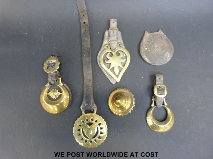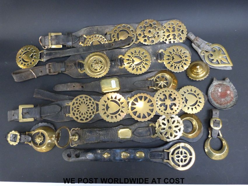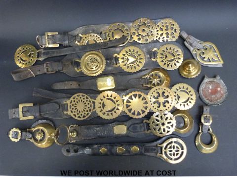 A quantity of martingales and other horse harnesses with brasses to include snowflake, heart, crescent, sunburst and other designs