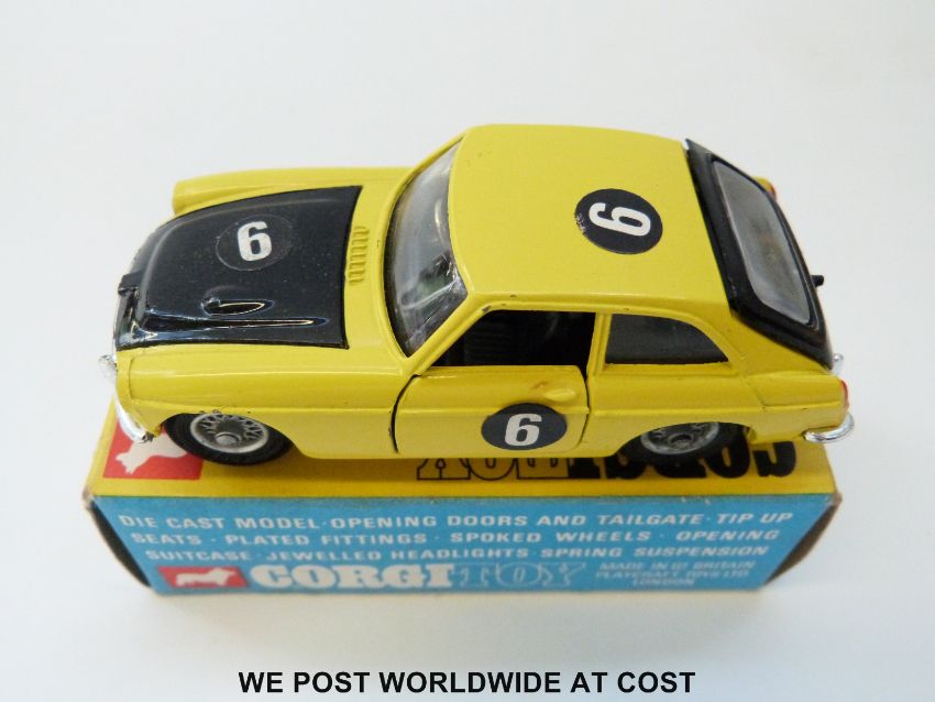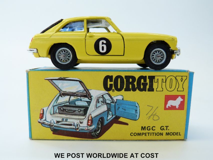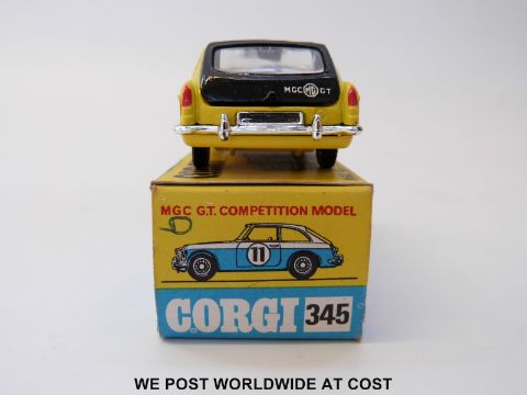 Corgi Toys diecast model MGC G.T. Competition Model, 345, with yellow body, black bonnet, tailgate and interior, racing number 6 and black suitcase, in original box.