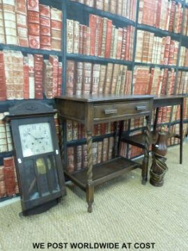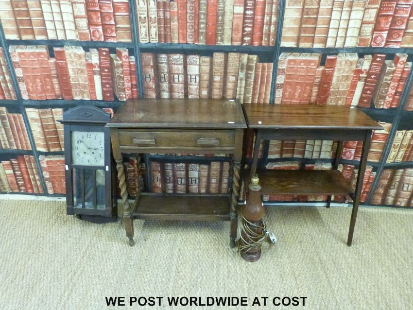 Two oak side tables, an oak cased wall clock and a rosewood lamp
