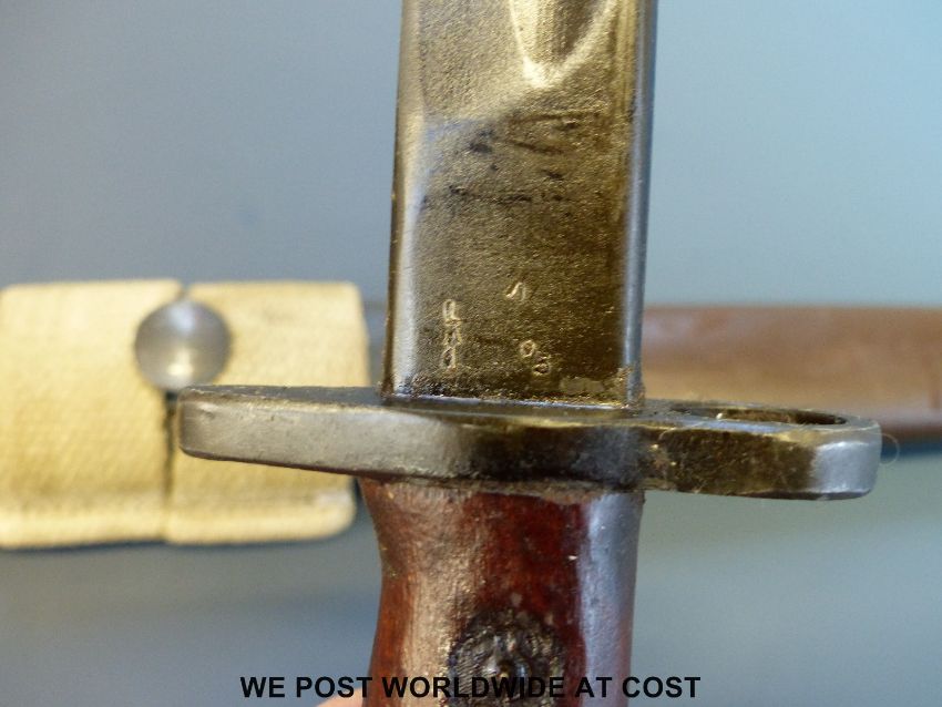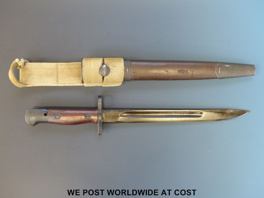 An Australian Owen sub-machine gun bayonet, in brown leather scabbard with webbing frog