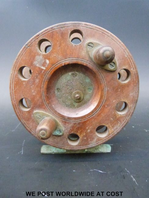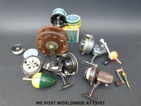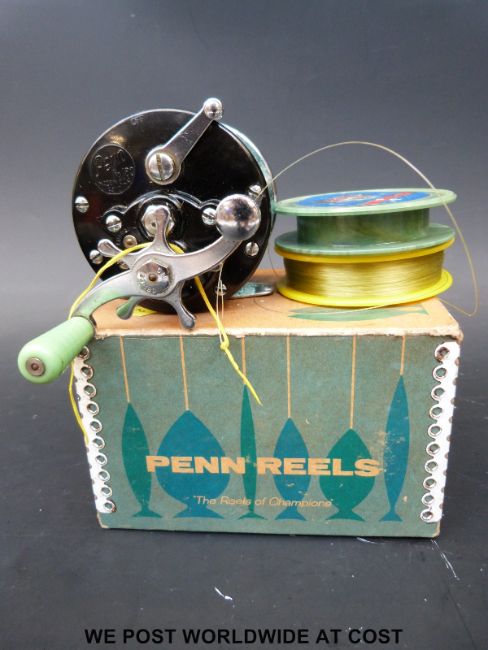 A small collection of vintage fishing tackle including a Penn multiplier reel