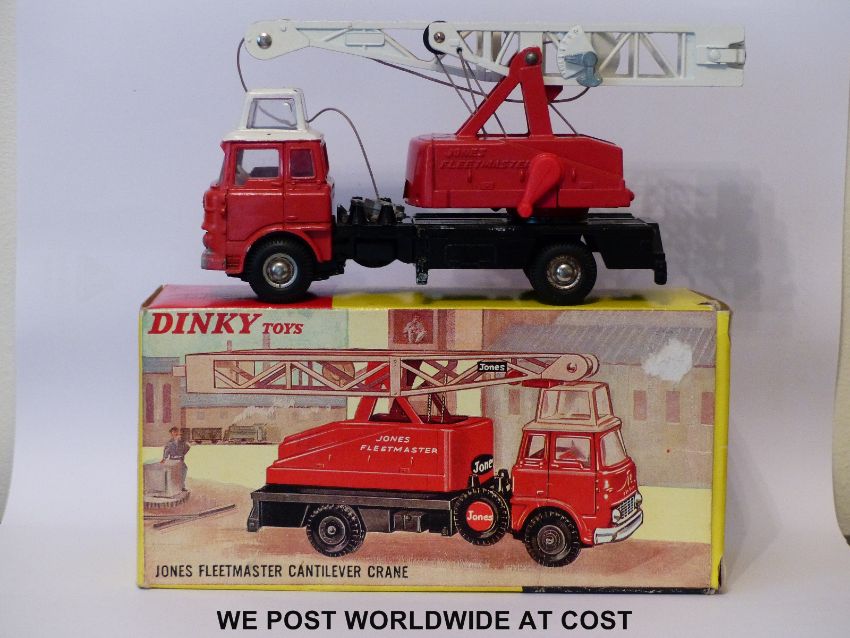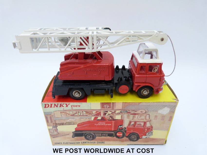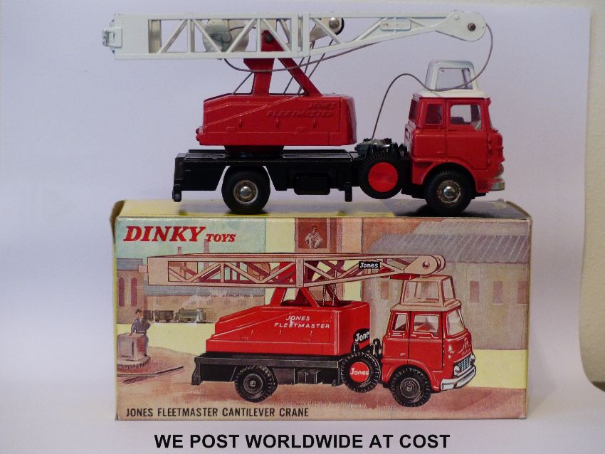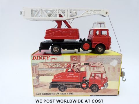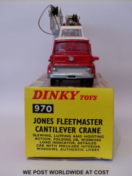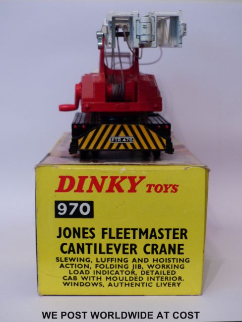 Dinky Toys diecast model Jones Fleetmaster Cantilever Crane, 970, with red cab and interior, white roof and jib and chrome domed hubs, in original box with two packaging pieces and instructions.