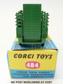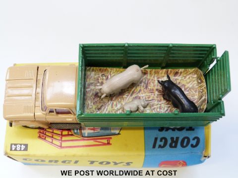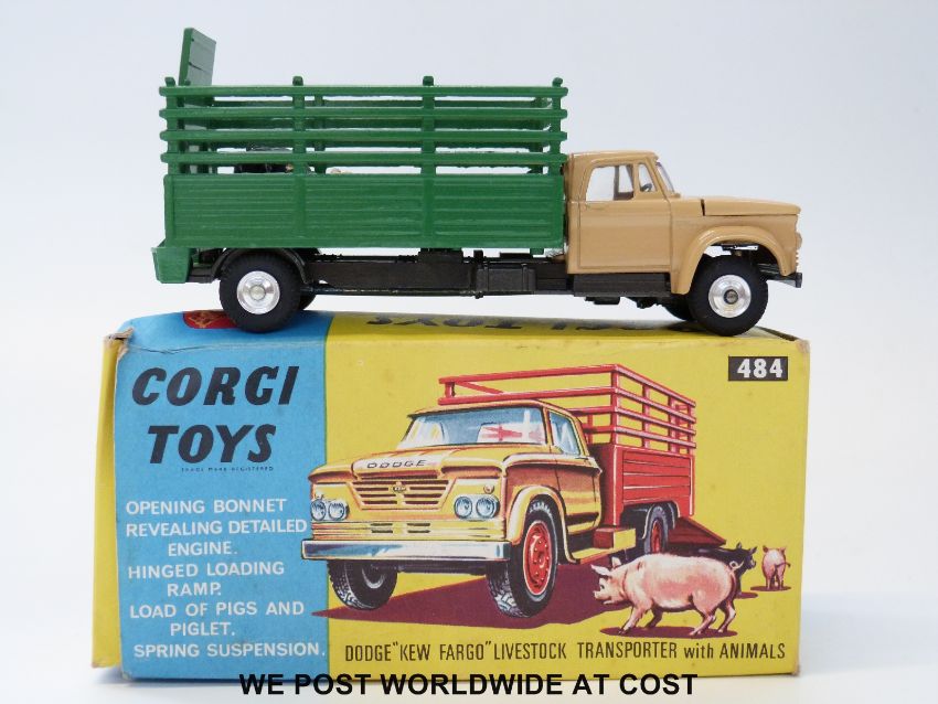 Corgi Toys diecast model Dodge 'Kew Fargo' Livestock Transporter, 484, with beige, green and graphite grey body, spun hubs and three pigs, in original box with packaging piece.