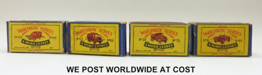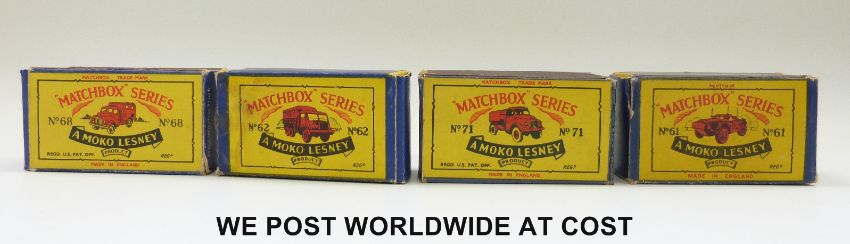 Twelve Matchbox Lesney 1.75 series diecast model vehicles, 5, 6, 10, 16, 50, 54, 61, 62, 62, 68, 71 and 74, four in original boxes