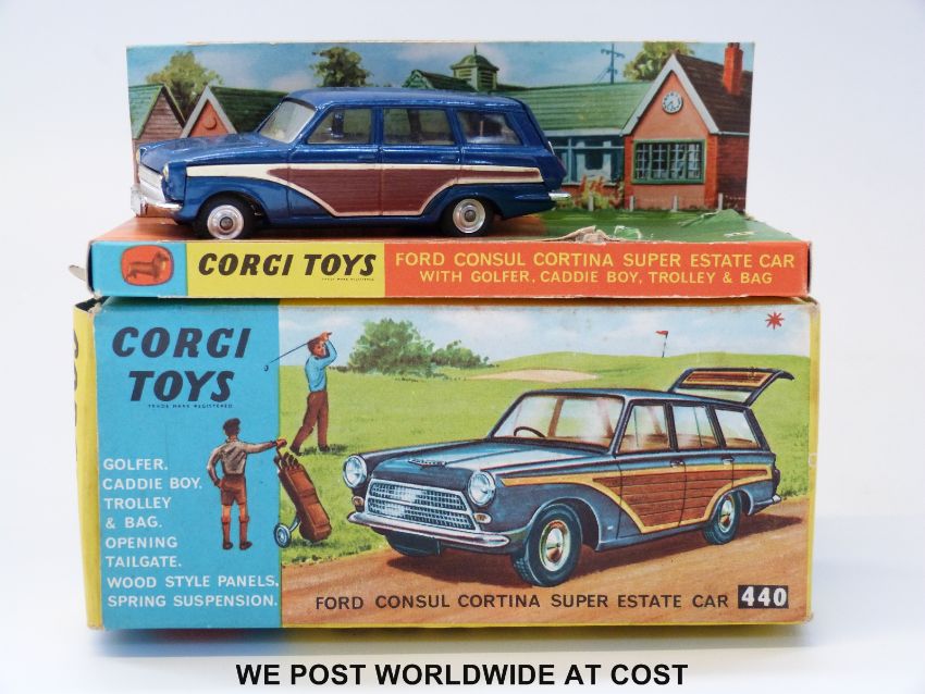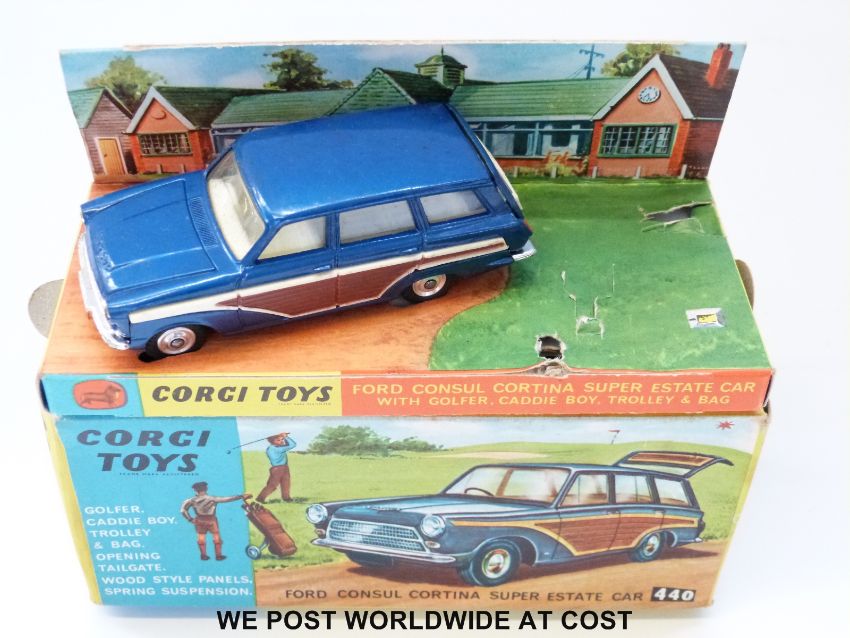 Corgi Toys diecast model Ford Consul Cortina Super Estate Car, 440, with metallic dark blue body, brown side panels and cream interior, in original box with picture display stand and packaging piece.