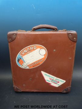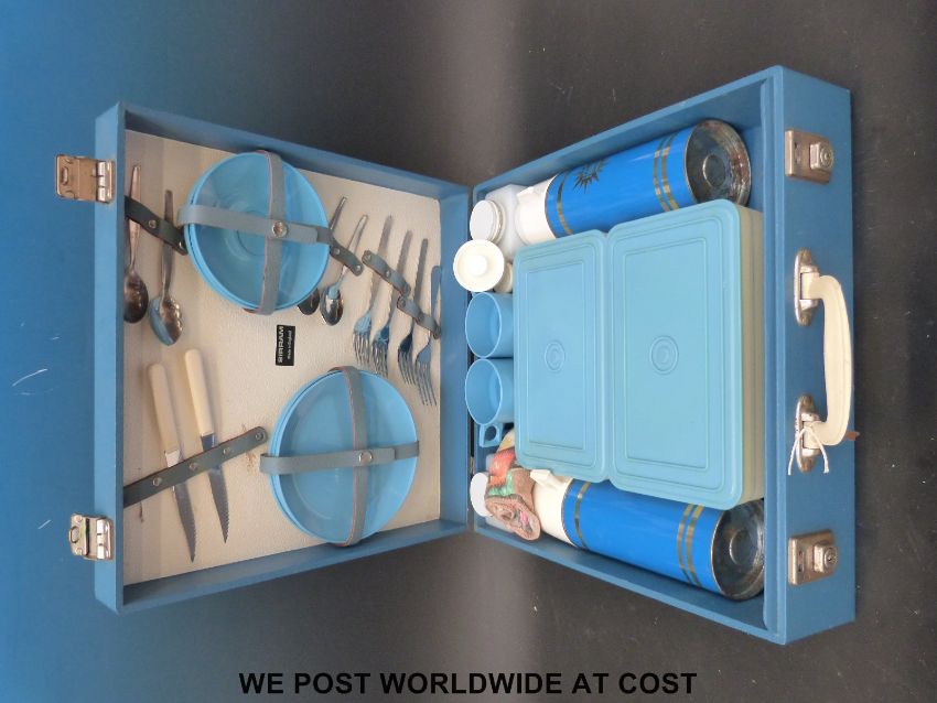 A retro Sirram picnic set, travelling case with Cunard sticker and a set of kitchen scales