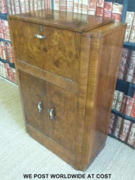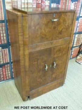 An Art Deco burr walnut drinks or cocktail cabinet with fitted mirrored interior to top section (W77 x D40 H117)