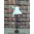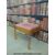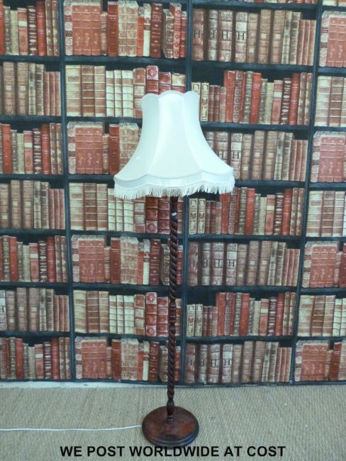 A Formica-topped table, standard lamp and two stools