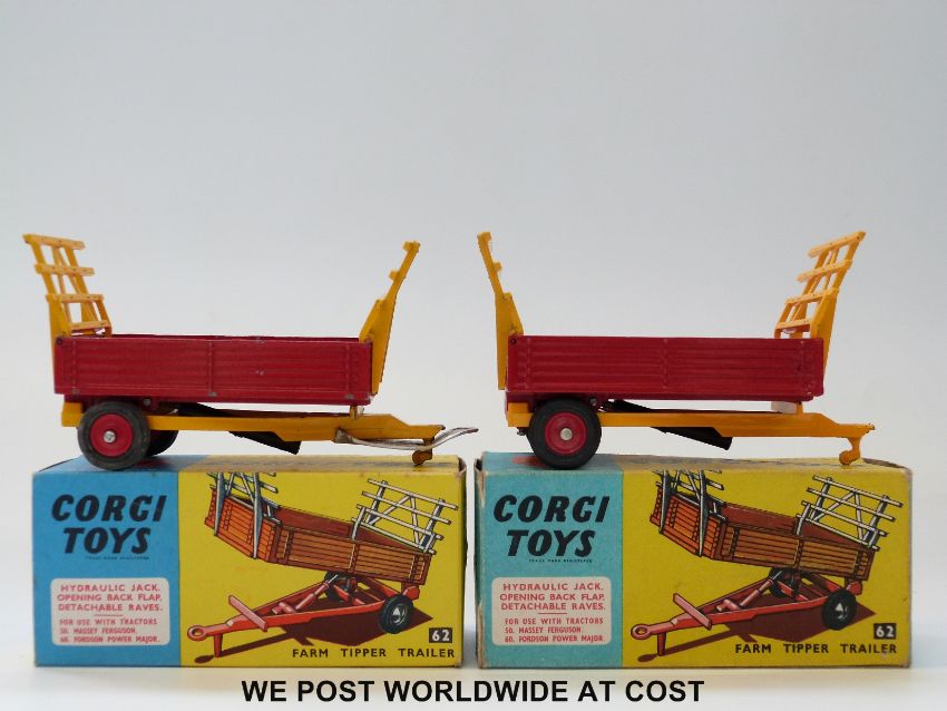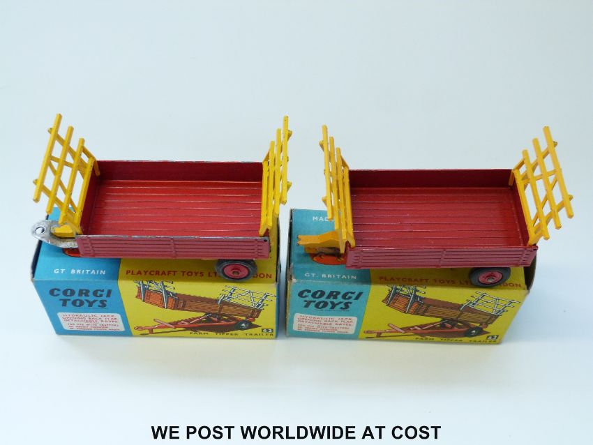 Two Corgi Toys diecast model Farm Tipper Trailers, 62, both with red body, yellow chassis, red wheels and two raves, in original box.