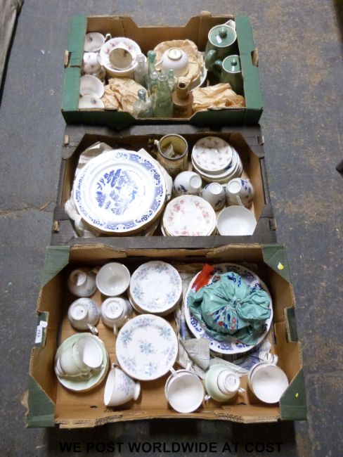 A large decorative collection of teaware including Copeland Spode, Royal Albert, Crown Staffordshire, Royal Worcester together with a small collection of vintage bottles including Stroud interest.