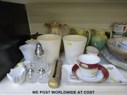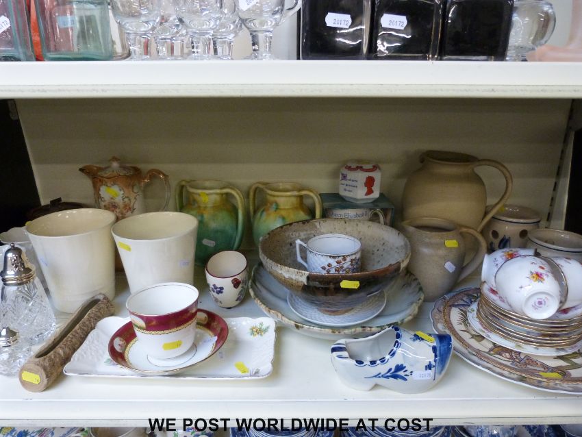 A collection of ceramics including part Royal Albert tea set, a Fielding & Co coffee pot, a Ball's Alma Mater tobacco jar, Delft Ware etc