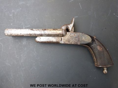 Double barrelled side by side pinfire hammer action pistol with carved grip, engraved locks, folding triggers and 4.5inch octagonal barrels, overall length 24cm