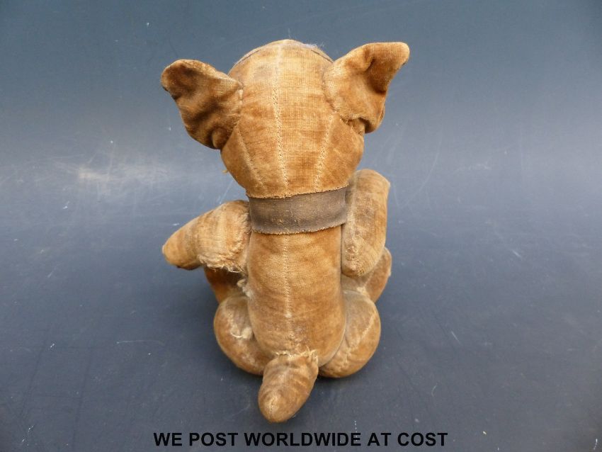 Chad Valley felt Bonzo dog with original leather collar and button, 18cm tall.