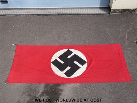 A Nazi Party Hamburg Town Hall banner or flag measuring 2.85m x 1.22m, removed from Hamburg town hall by a Royal Artillery Officer in 1945, the banner has two metal swivel clips at each end