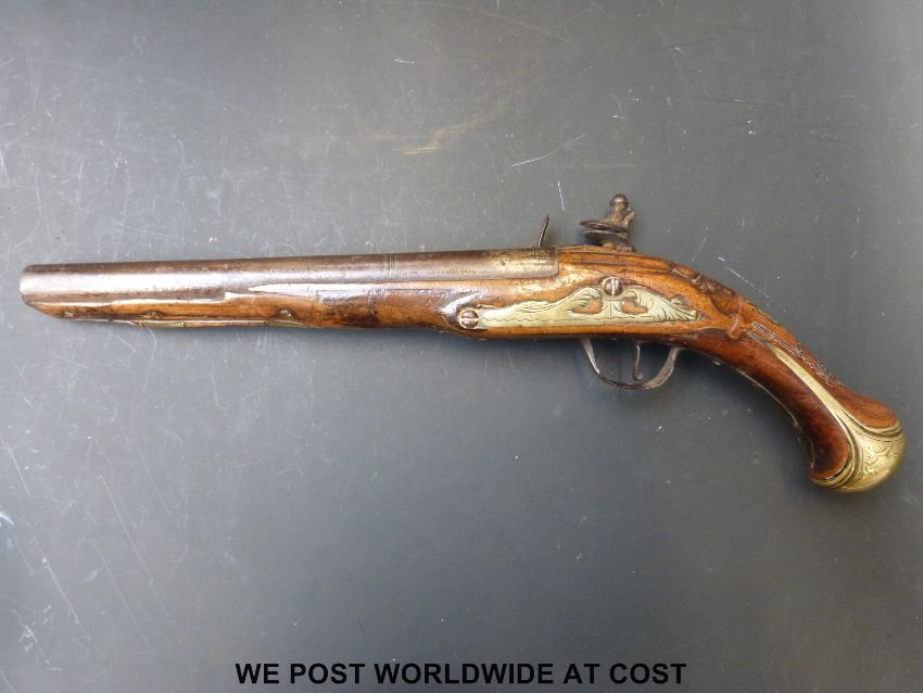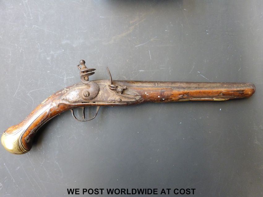 Flintlock hammer action holster pistol with engraved brass mounts, ornately carved and wire inlaid stock and 9.25inch indistinctly named barrel, overall length 41cm