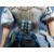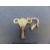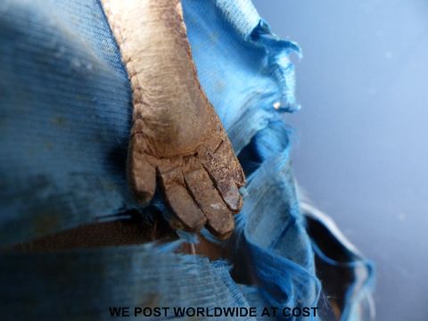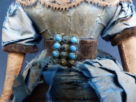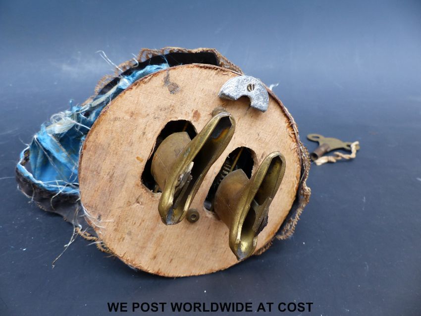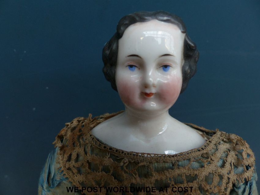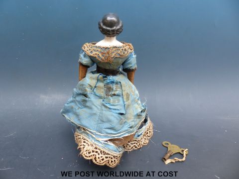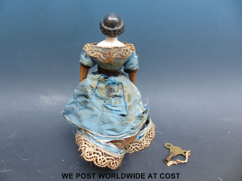 An American clockwork auto Peripatetikoss walking doll with porcelain head and shoulders, black painted hair, kid leather arms, padded body, dressed in silk dress with lace and turquoise decoration with interior mechanism, brass walking boots and original key