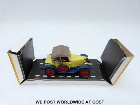 Dinky Toys diecast model 1913 Morris Oxford (Bullnose), 476, with yellow body, blue chassis, red wheels and fawn hood, in original box.