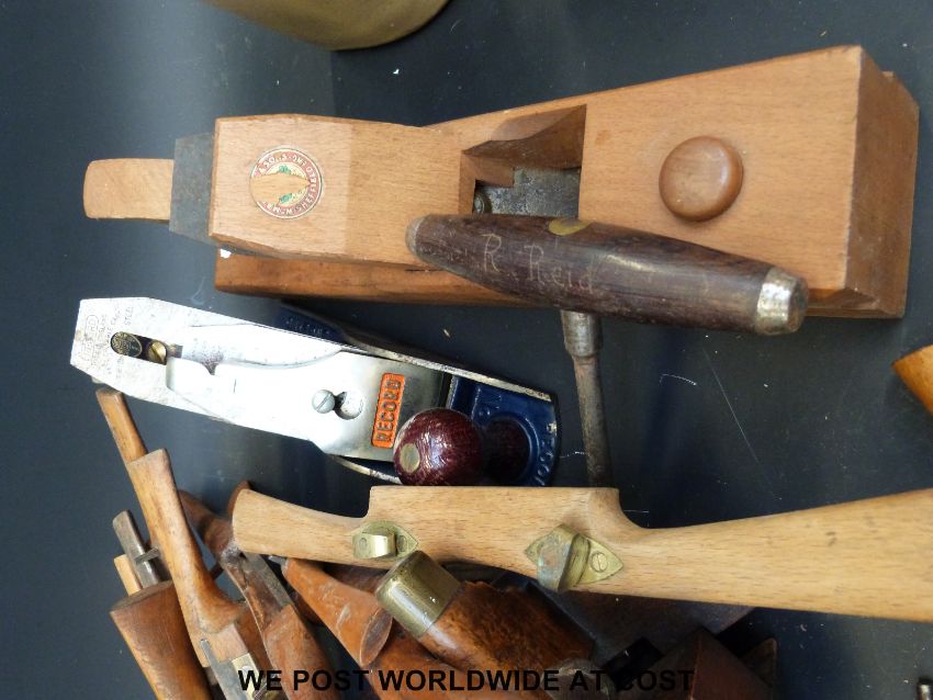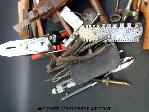 A quantity of woodworking tools to include spokeshaves, Marples plane, boxed Rapier 400 and Record 04 planes, plough plane, large clock key, two stoneware hot water bottles including Bristol example etc
