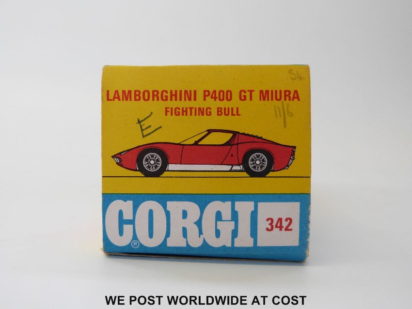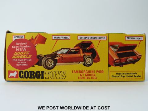 Corgi Toys Whizzwheels diecast model Lamborghini P400 GT Miura, 342, with lime green body, red interior, fighting bull figure, Take-Off wheels and Golden Jacks, in original window box.