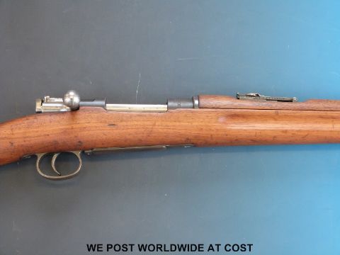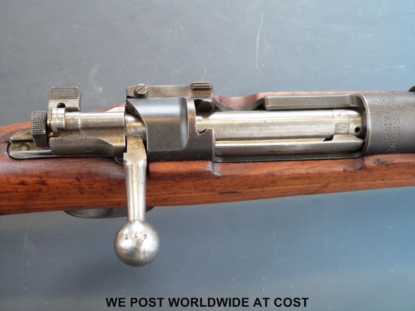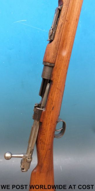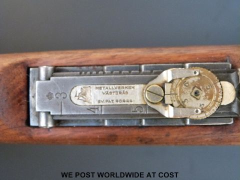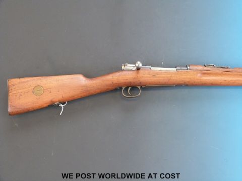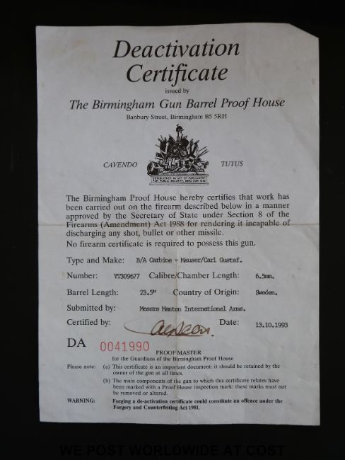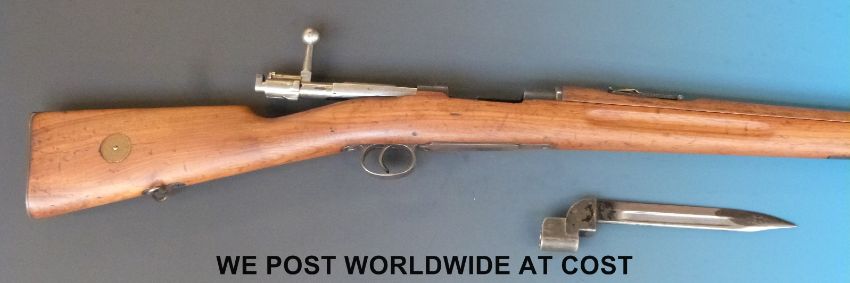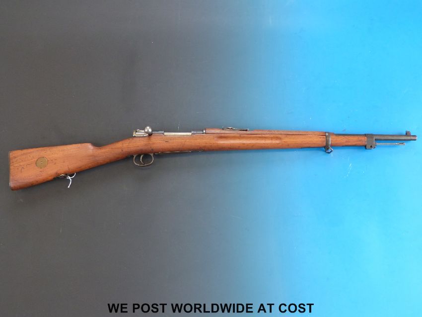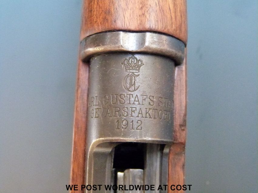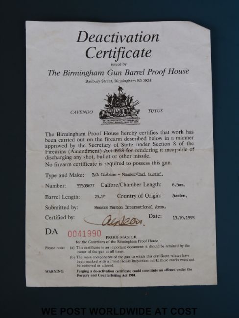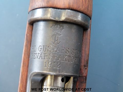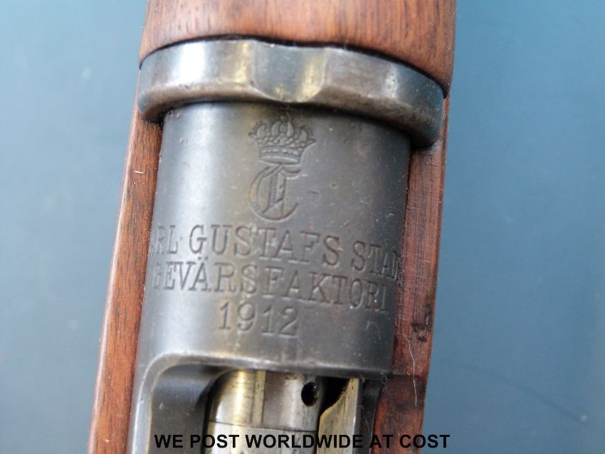 A deactivated Carl Gustaf Mauser bolt action carbine rifle and bayonet, stamped to the breech 'Carl Gustafs Stads Gevarsfaktori 1812' with brass numbered plate to the stock and multiple stamped proof marks, serial number YT308677, 23.5inch barrel, overall length with bayonet 135cm. With deactivation certificate