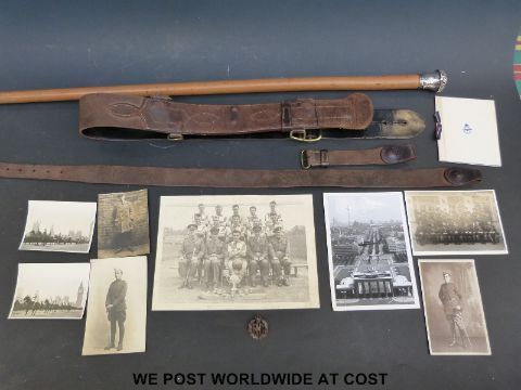 A WWI leather Sam Brown belt formerly the property of 2nd Lieutenant WHC Robson Royal Flying Corps together with a white metal topped cane and an RFC cap badge and a group of photographs of Lt. Robson wearing the belt