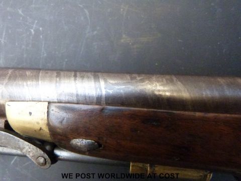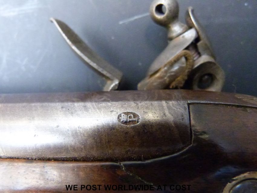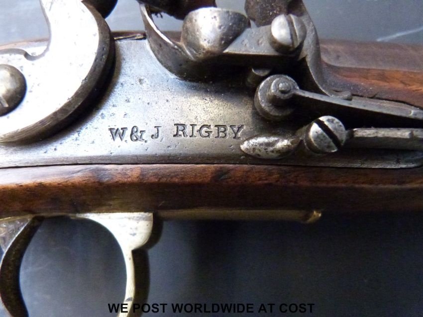William & John Rigby, Dublin, New Land pattern flintlock hammer action pistol with brass trigger guard and mounts, captive ramrod, named lock and 9inch Damascus barrel, c1790, overall length 38cm