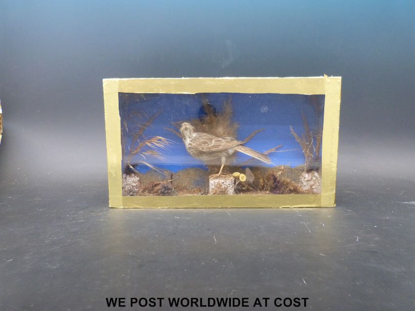 A cased taxidermy study of a corn bunting (21 x 37 x 8cm)