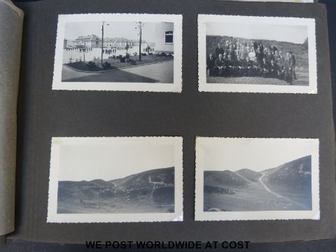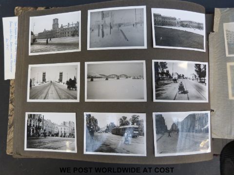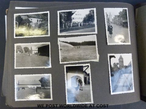 An album of German WWII photographs detailing troop life in Hanover and Berlin including photographs of the destruction of areas of Germany; troops engaged in military operations or and relaxation. Approximately 180 photographs all mounted in an adzed oak album