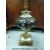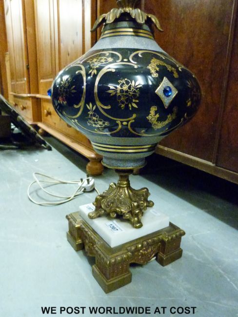 A large 19thC style brass and ceramic lamp (Height 110cm)