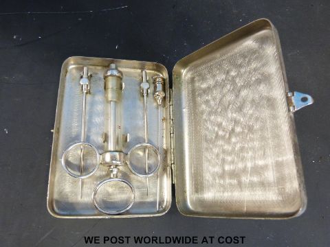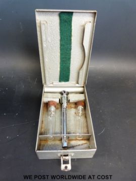 A doctor's four-drawer leather portable chest, containing various instruments including cased glass syringe and needles, cased set of forceps, Spencer Wells dressing, glass eyebaths, specimen syringes in case, glass stoppered bottles in tray etc