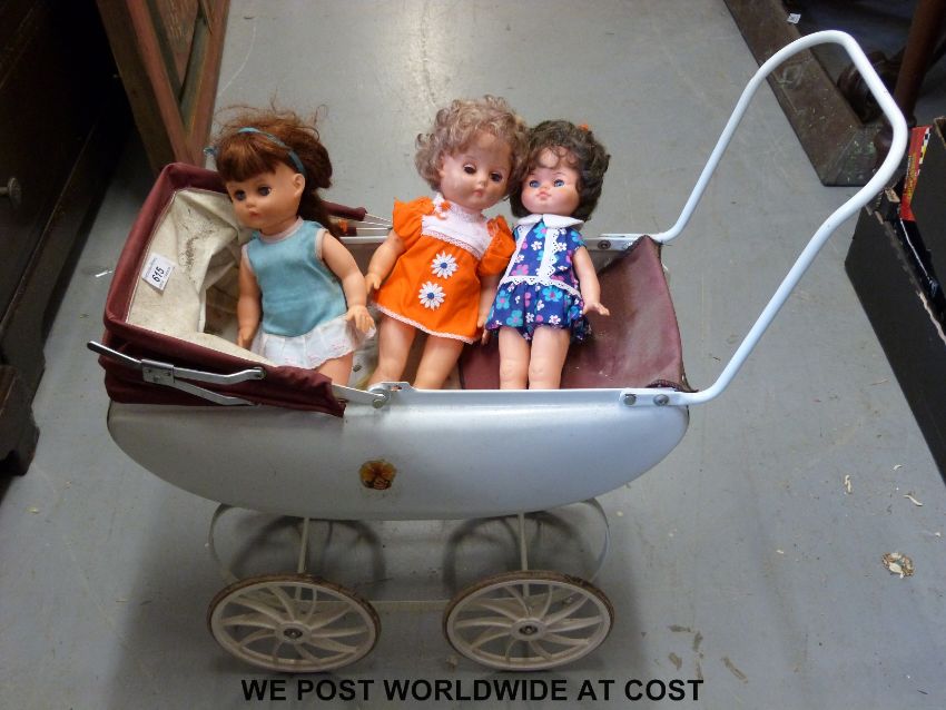 A 1960's Tri-ang doll's pram, complete with three dolls from c1970s