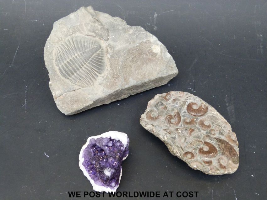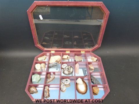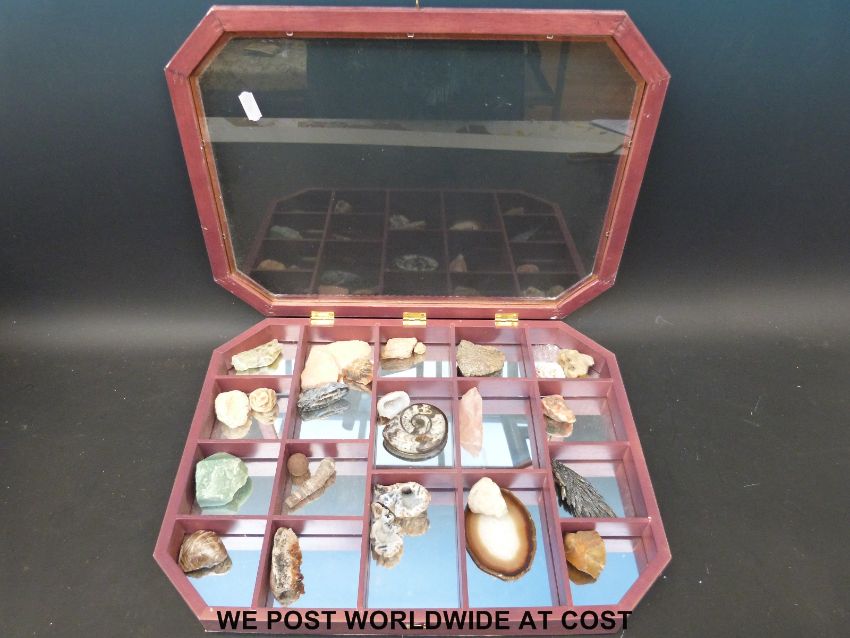 A quantity of geological samples, fossils etc to include agate, fools gold, malachite etc in display cases