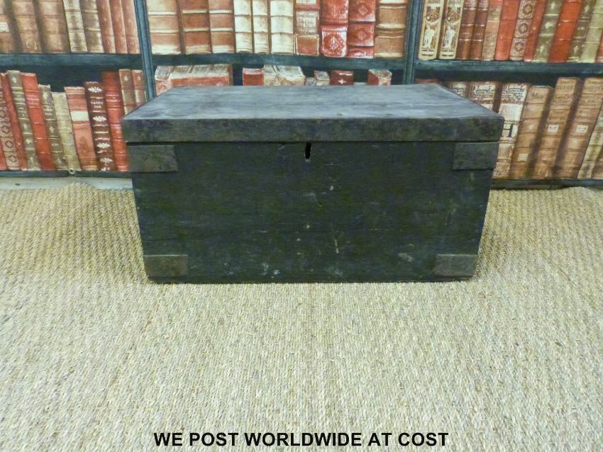 A metal bound wooden strongbox/ travelling trunk with candle box (W61 D50 H51)