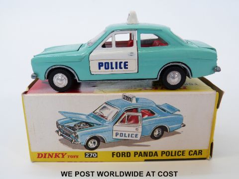 Dinky Toys diecast model Ford Panda Police car, 270, with turquoise body, white doors and blue and white Police sign, in original box.